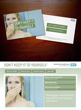 In addition it was decided, from the user profiling, that the campaign site needed to promote the benefits of membership to BHFT and thus grow the membership base - one of the KPIs for BHFT. This would be launched on World Mental Health Day (10th October 2008). "Don't Keep it To Yourself" was developed as a campaign creative theme, and the microsite encouraged users (of the website and services) to share their mental health stories and experiences.